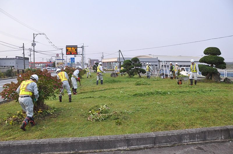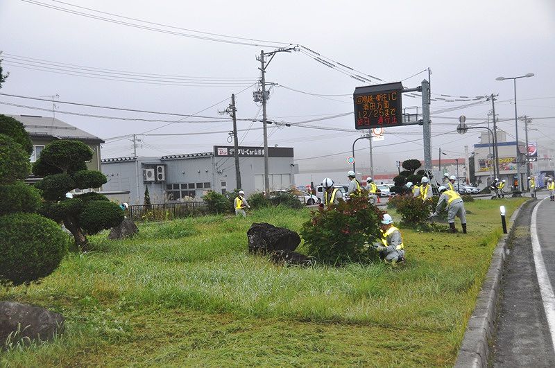 R13・R47分岐部緑地帯の早朝除草ボランティア活動。お盆の帰省客を迎える前に今年第2回目の除草を行い